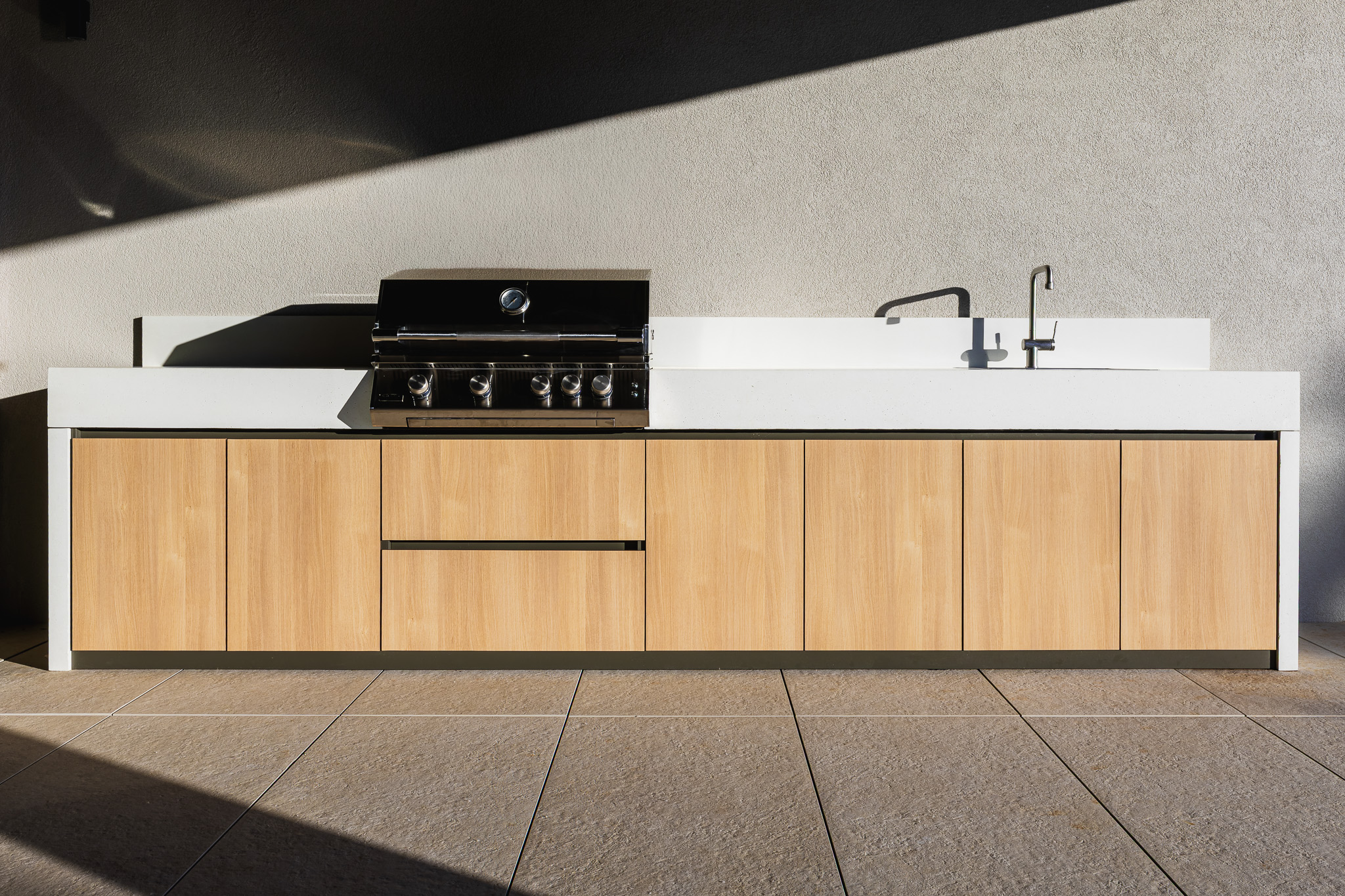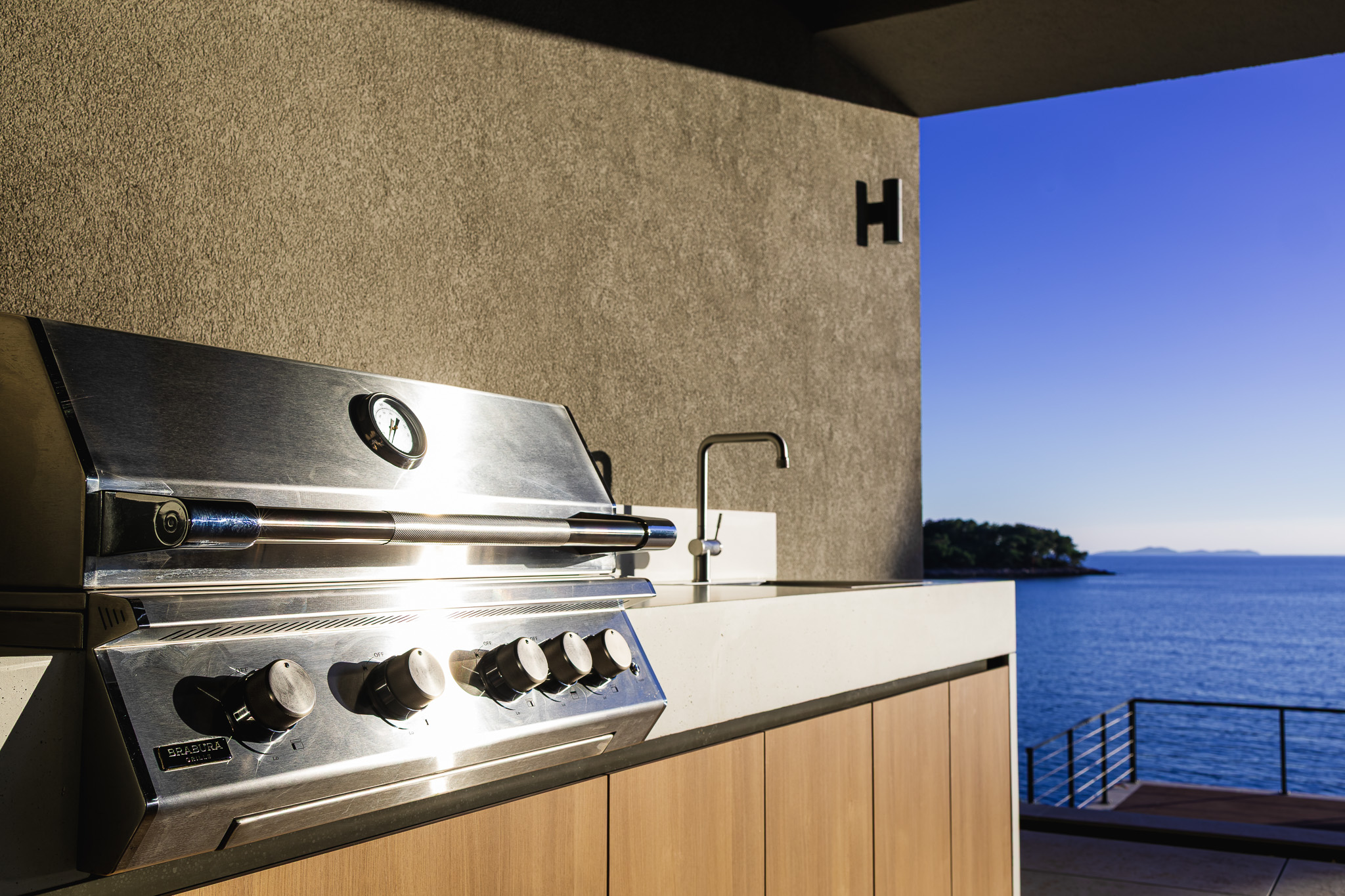 Na Korčuli smo realizirali bespoke outdoor kuhinju koja se prirodno uklopila u cjelinu kuće i način života na otoku. Projekt je nastao u suradnji s arhitektom Mariom Furčićem, s jasnim ciljem: stvoriti vanjsku kuhinju koja će biti funkcionalna, suvremena i nenametljiva, ali istovremeno snažna kroz materijal i precizan detalj.